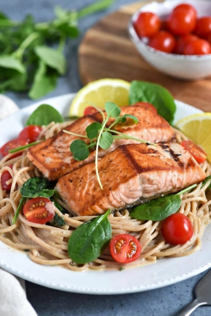 Whip up this healthy salmon pasta recipe in just 30 minutes! Packed with omega-3-rich salmon, fresh spinach, cherry tomatoes, and bright lemon flavors for a nutritious, delicious dinner the whole family will love.