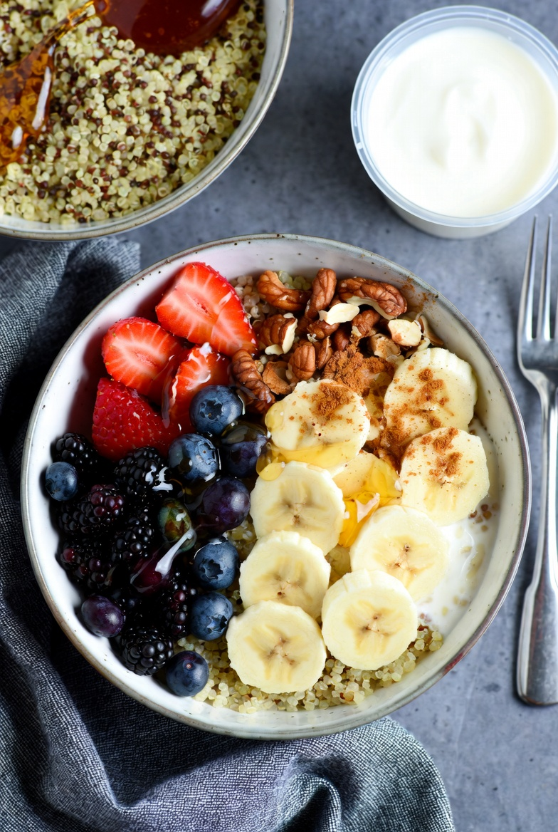 - This recipe includes quinoa, mixed berries, bananas, nuts, honey, and optional Greek yogurt for added taste and nutrition.